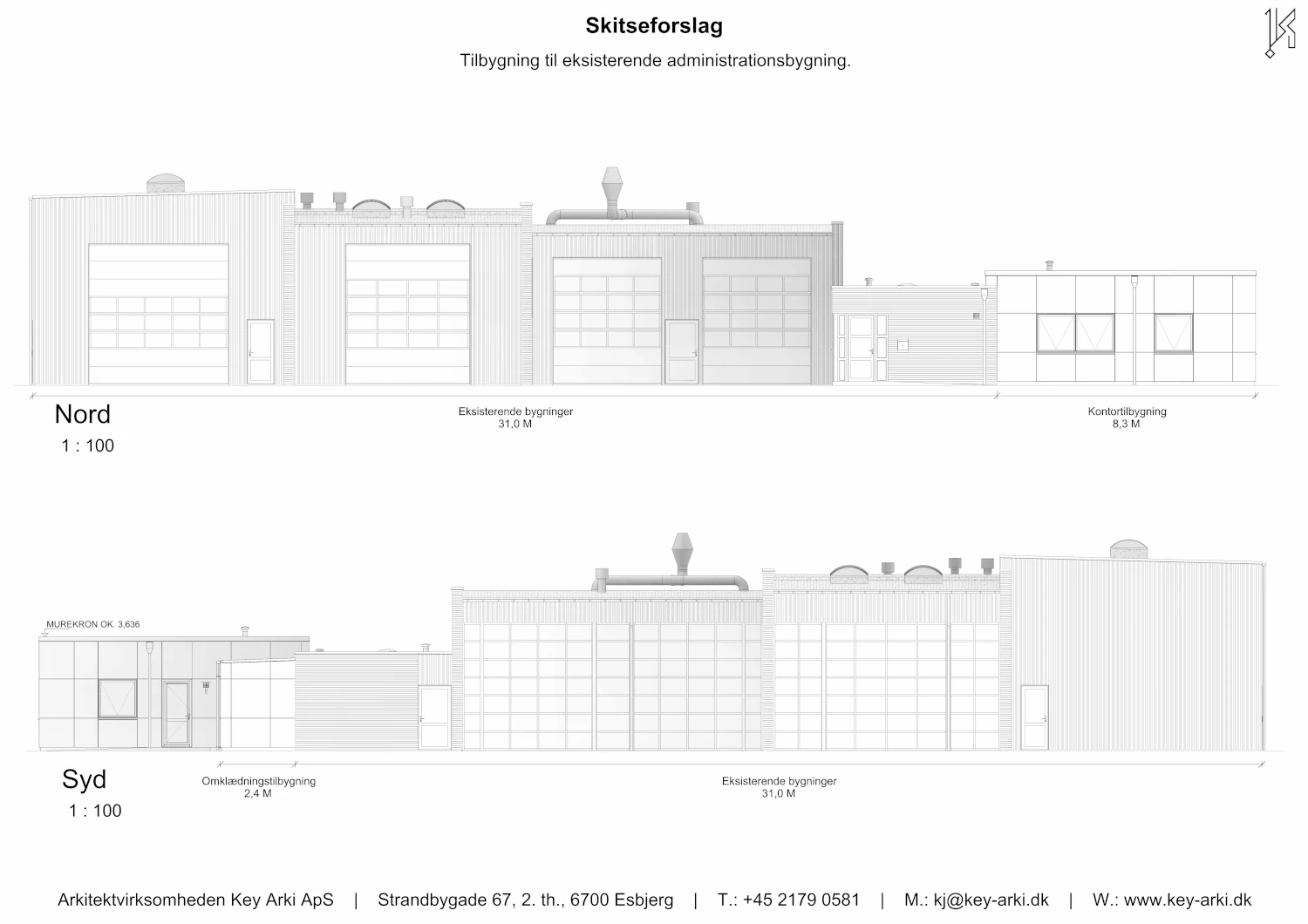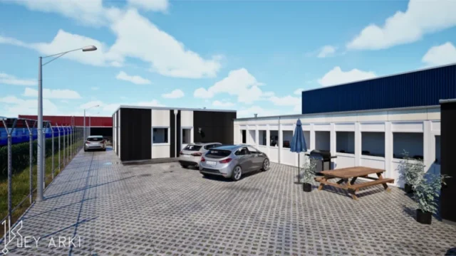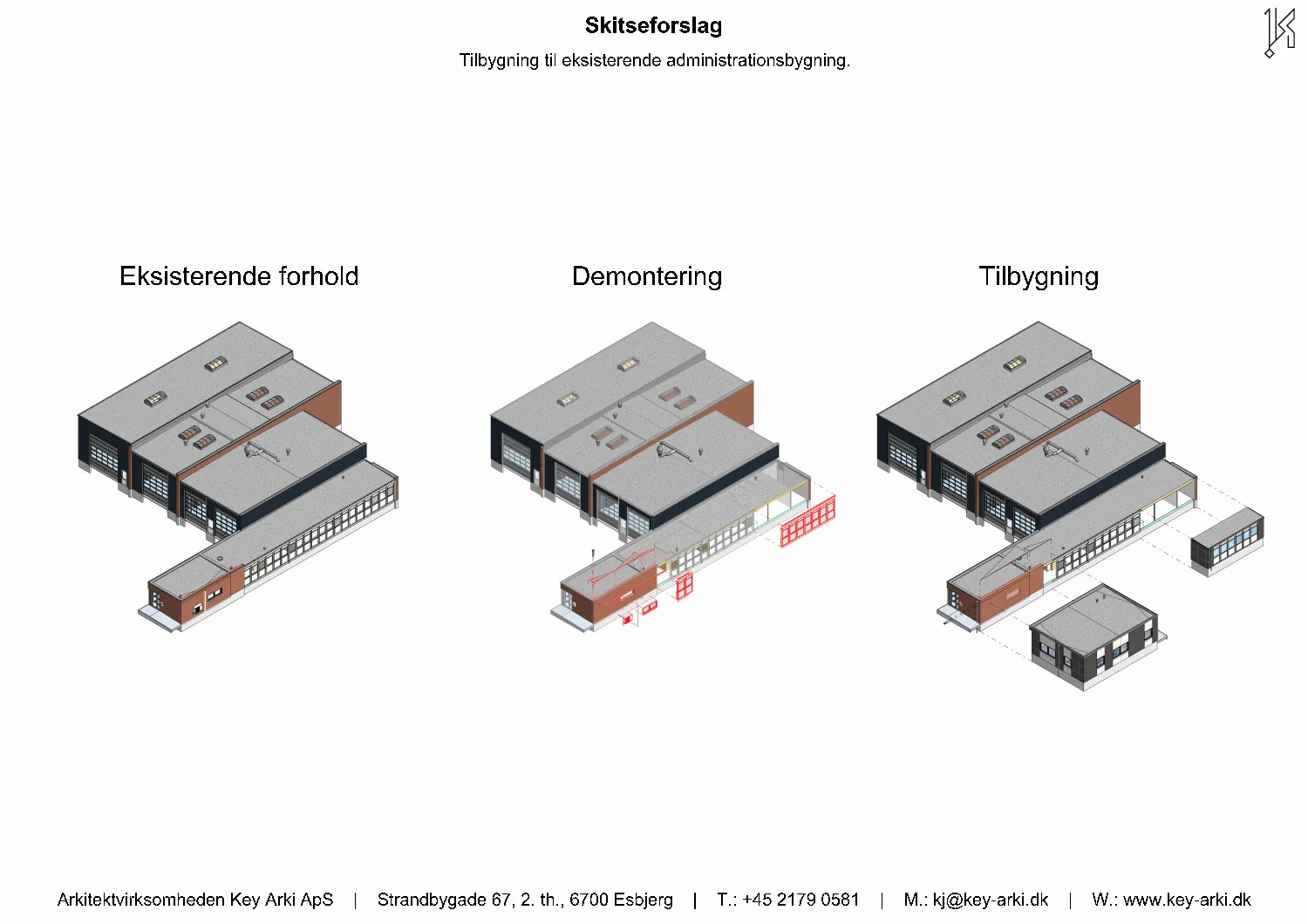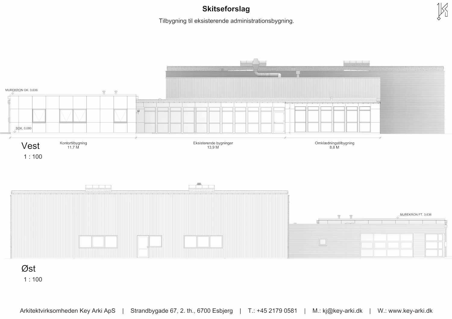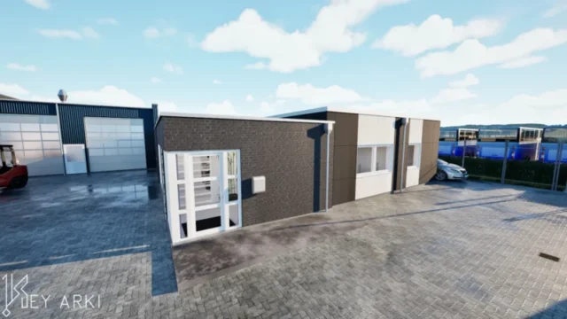 Erhverv i industrikvarteret i Sædding ved Esbjerg. Key Arki har udarbejdet et arkitektonisk og funktionelt skitseforslag til udvidelse af en eksisterende erhvervsbygning. Projektet omfatter en ny administrationsfløj på 97 m² samt en udvidelse af omklædningsfaciliteterne med yderligere 23 m².