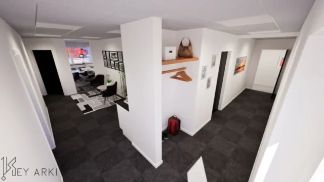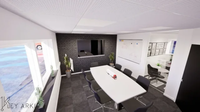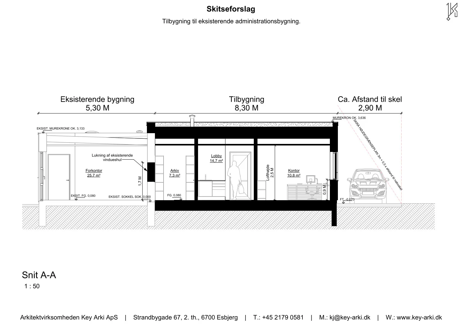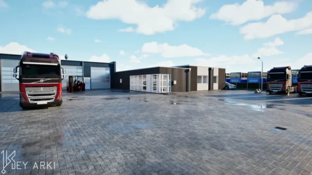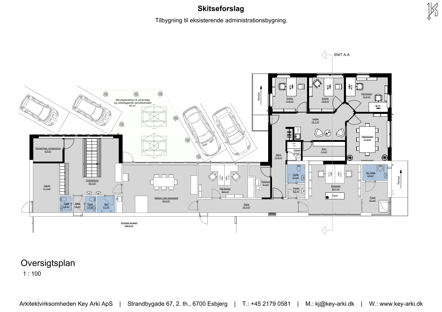 Erhverv i industrikvarteret i Sædding ved Esbjerg. Key Arki har udarbejdet et arkitektonisk og funktionelt skitseforslag til udvidelse af en eksisterende erhvervsbygning. Projektet omfatter en ny administrationsfløj på 97 m² samt en udvidelse af omklædningsfaciliteterne med yderligere 23 m².